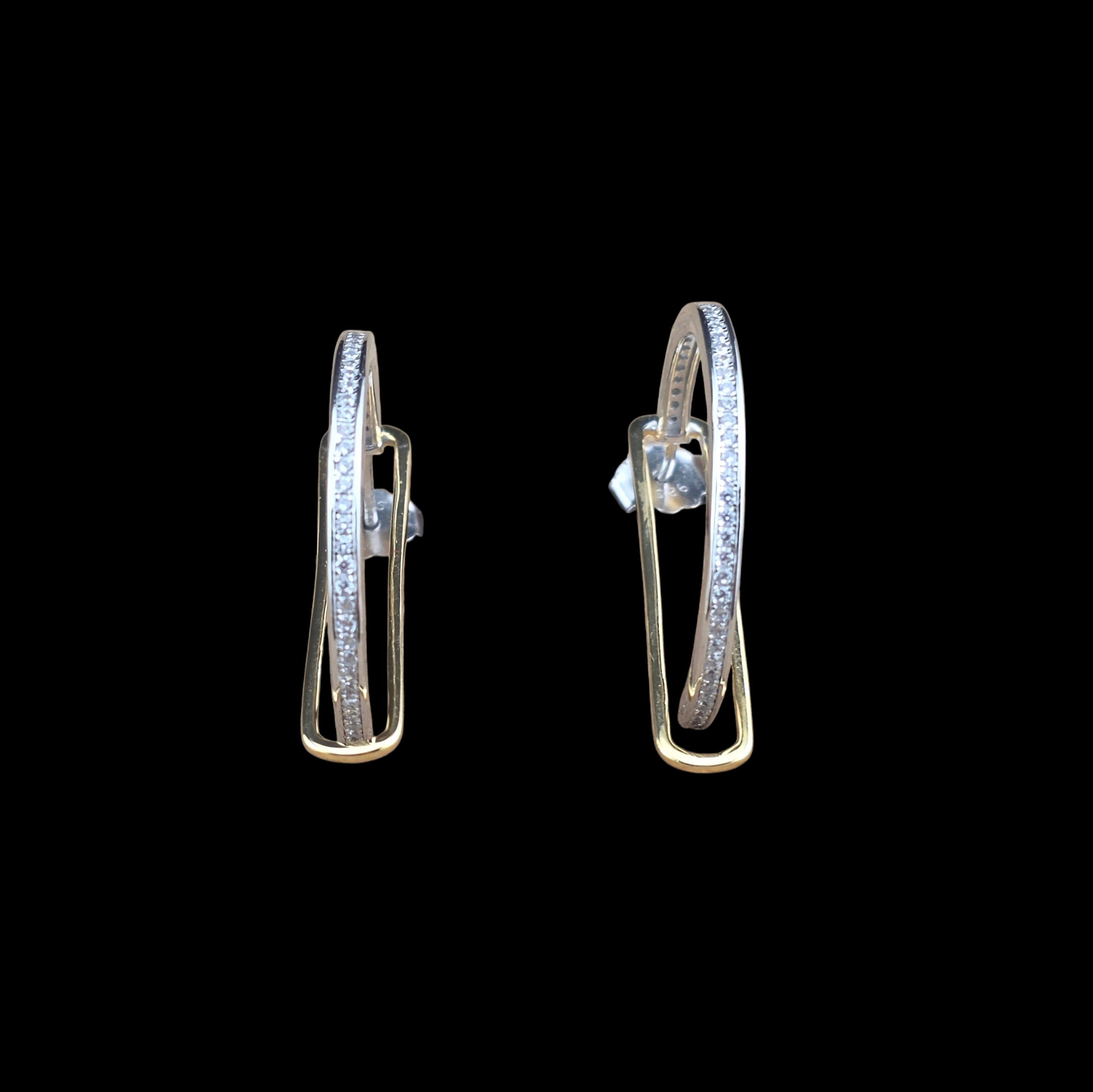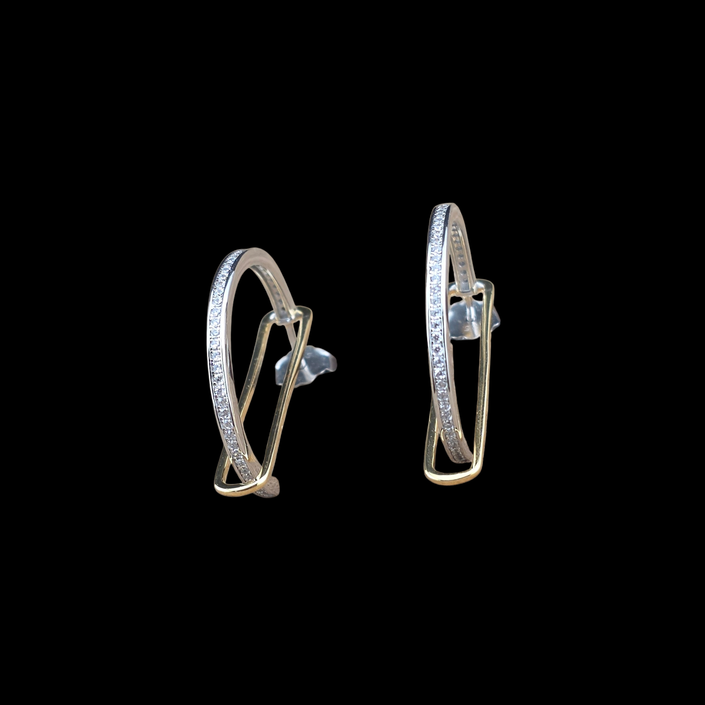Particolari, originali, un semi cerchio  placcato rodio con zirconi che nasce da un rettangolo di oro giallo.