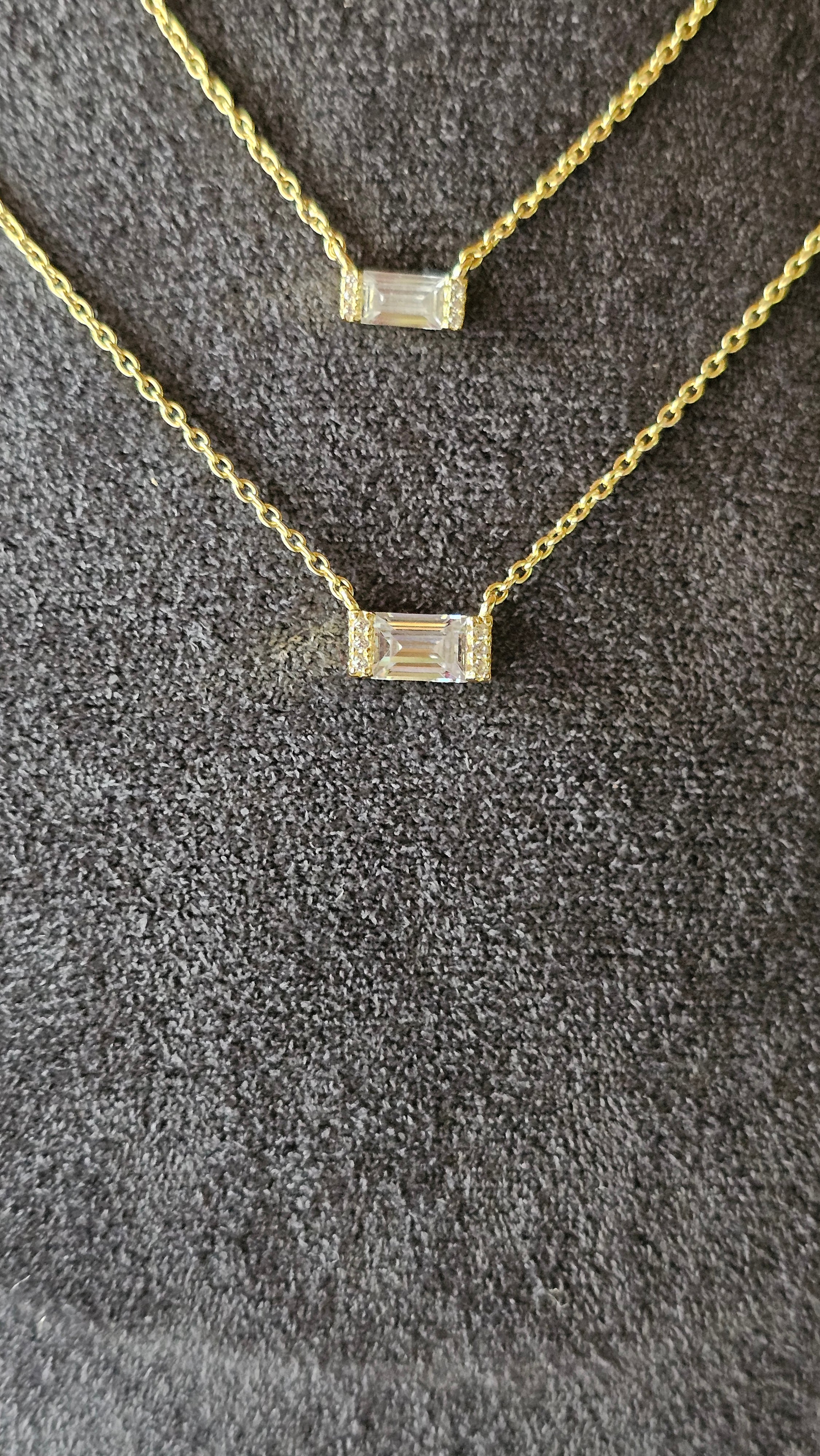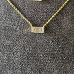La baguette centrale misura 3×5 mm e ai lati presenta piccoli zirconi.